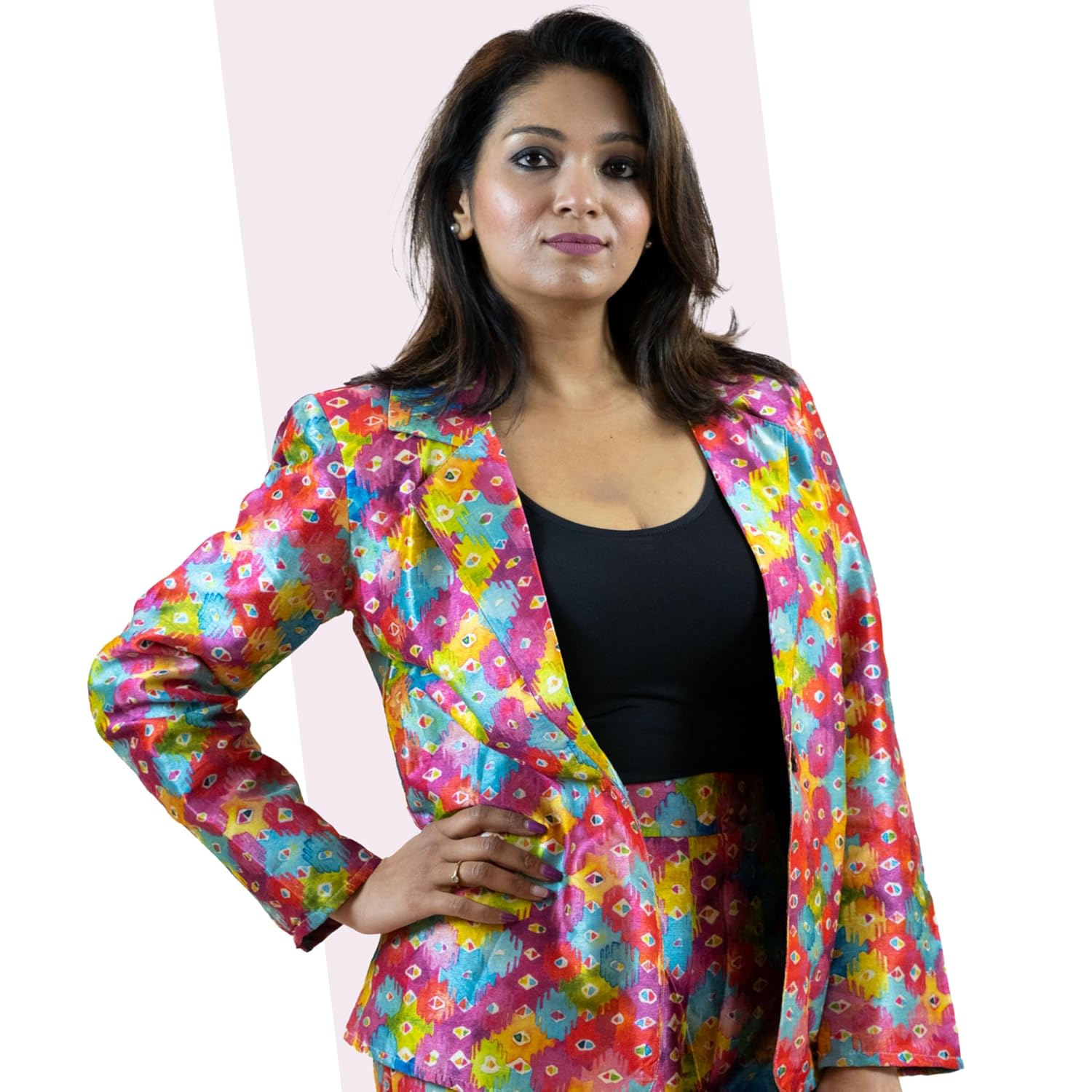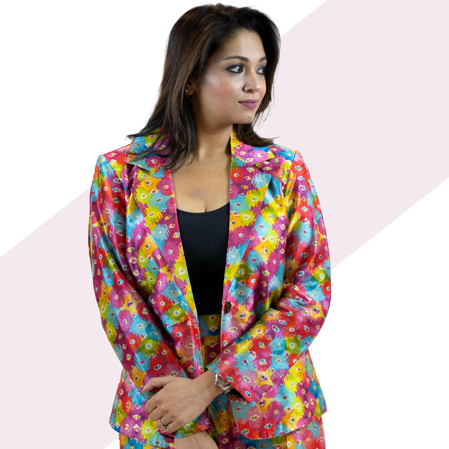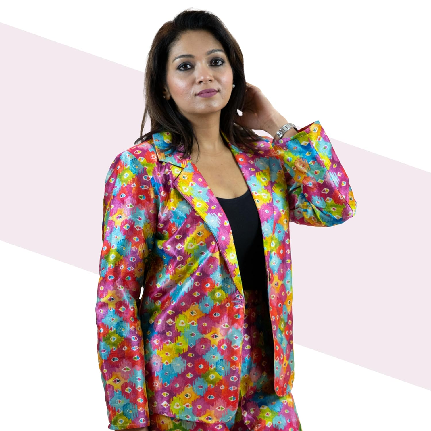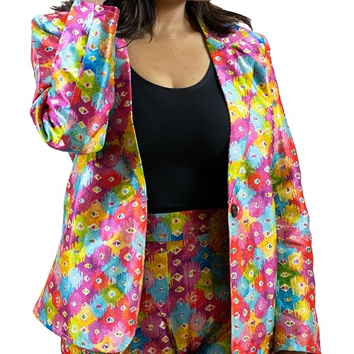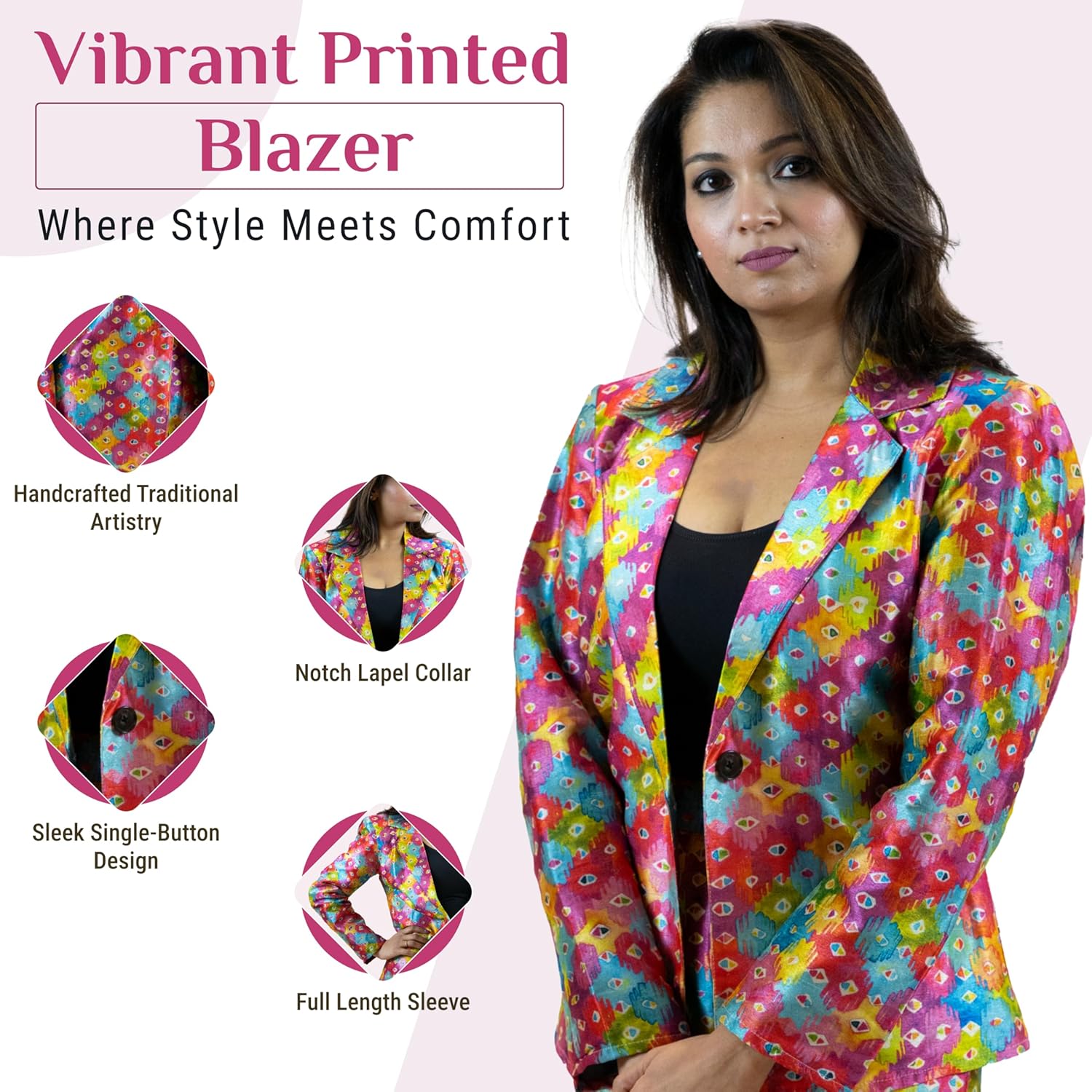 - Vibrant & Unique Colorful Blazers for Women : Stand out in a multicolor hot pink blazer & two-toned blazer featuring an eye-catching tie dye print. Hand-printed in Rajasthan, this statement jacket merges Indian-inspired artistry with modern style for a truly one-of-a-kind floral jackets for women