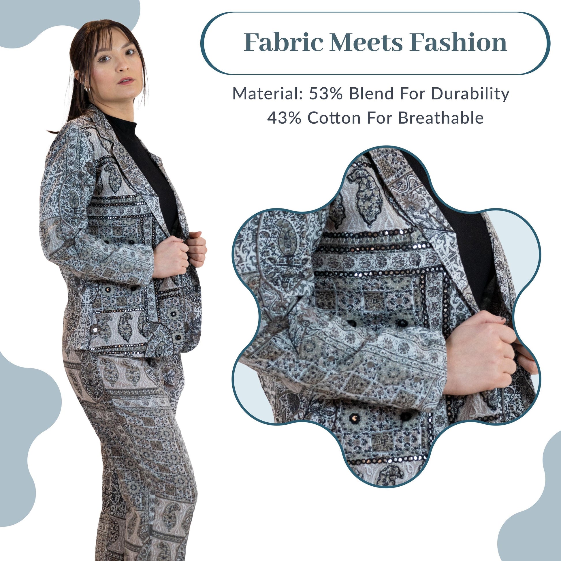 - Design: Monochrome black, white, and gray tones with intricate mirror work on the front of the blazer, paired with paisley and Moroccan-inspired prints.