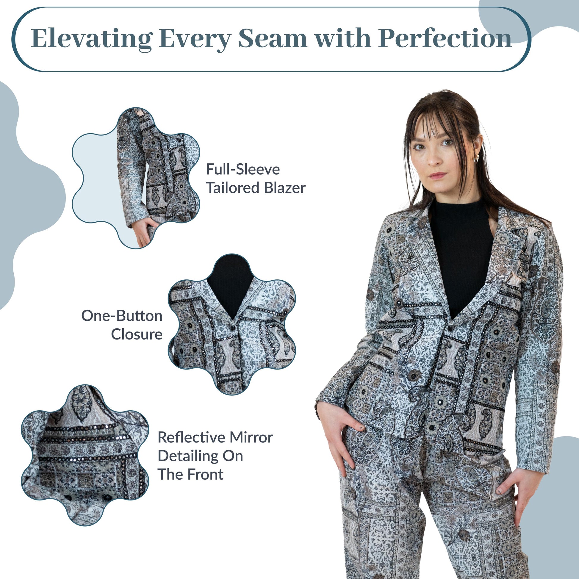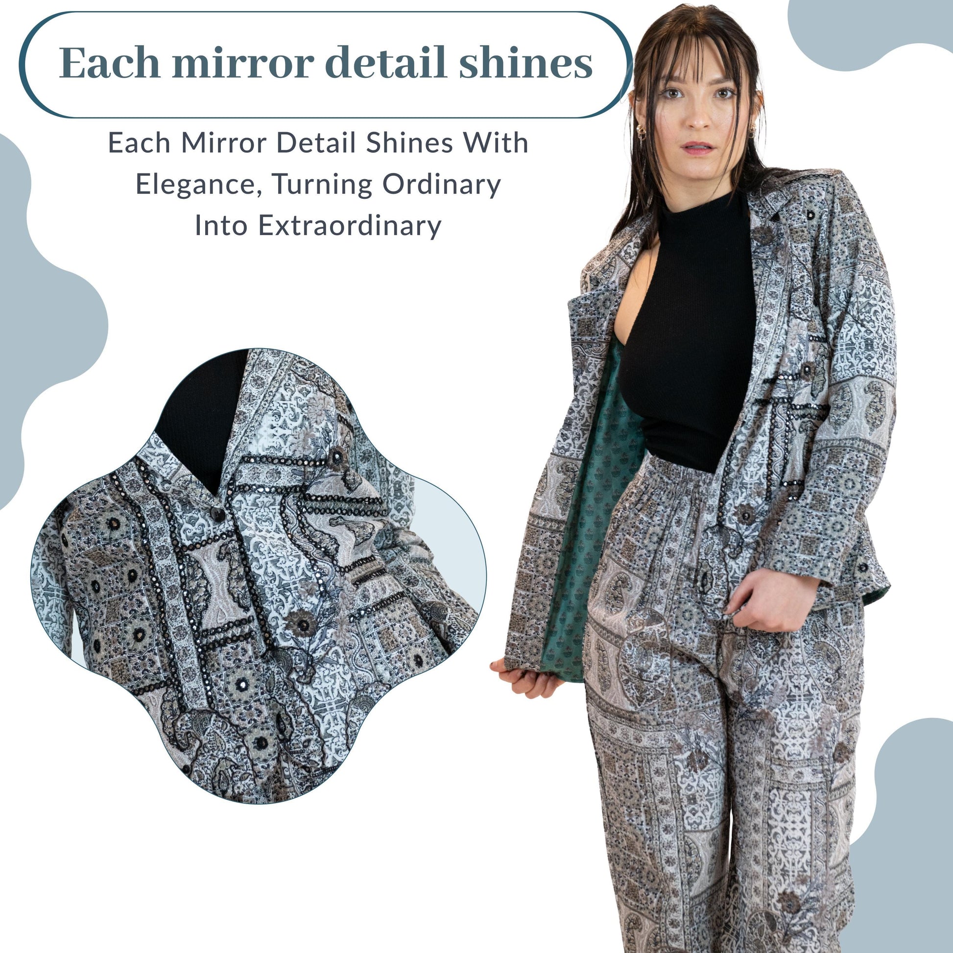 Elevate your formal and cocktail attire with this stunning Monochrome Mirror Work Co-ord Set. Featuring a chic black, white, and gray color palette, this set blends traditional paisley and Moroccan prints with modern mirror work details for a bold, yet sophisticated look. The full-sleeve blazer and tapered trousers create a sleek silhouette, while the mirror work adds a touch of glamour. Whether you're attending a wedding, office event, or cocktail party, this co-ord set is a perfect choice for those who want to stand out in style.