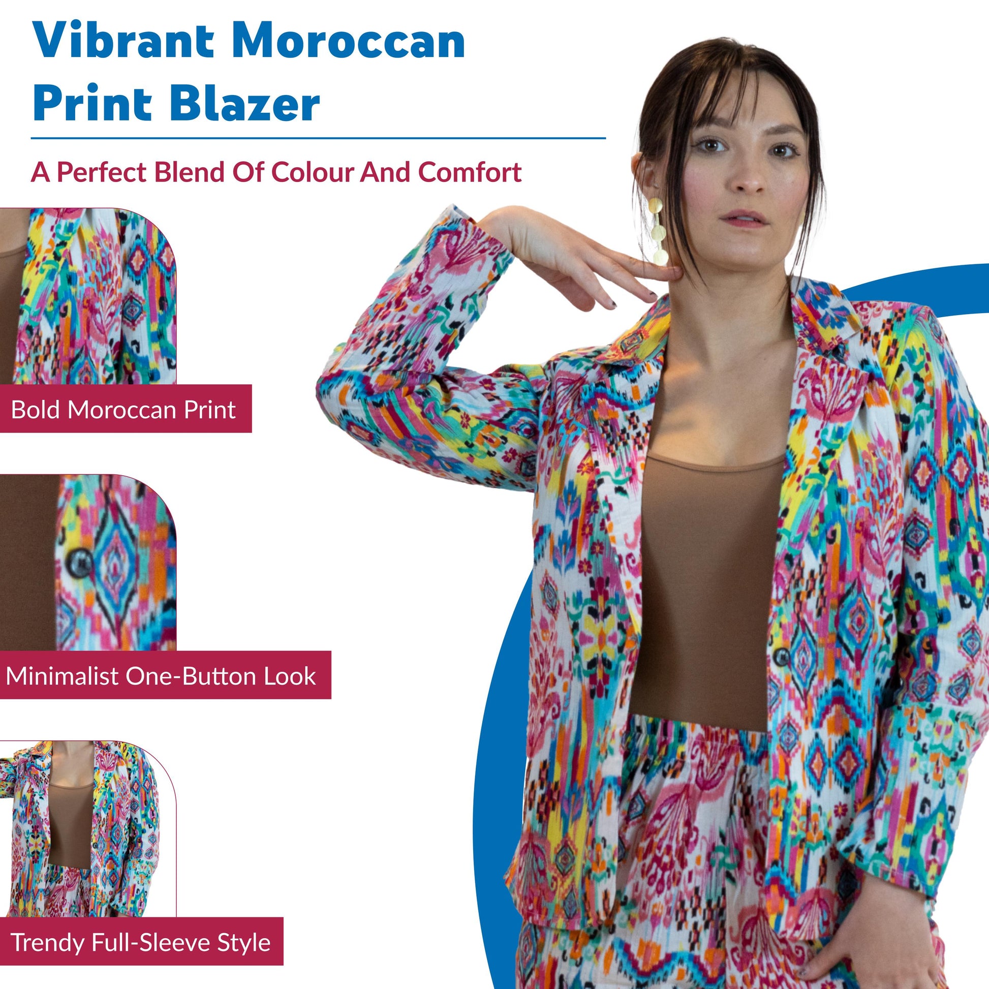 Add an exotic flair to your wardrobe with this Moroccan print blazer-style jacket, designed to offer both elegance and comfort. Featuring a structured silhouette and full sleeves, this jacket is perfect for business casual occasions, weddings, or any event where you want to stand out. The vibrant fall-inspired colors or playful pink and multicolor options bring a fun, sophisticated touch to your look. Crafted from a cotton-viscose blend, this jacket offers breathability and a smooth, polished finish.