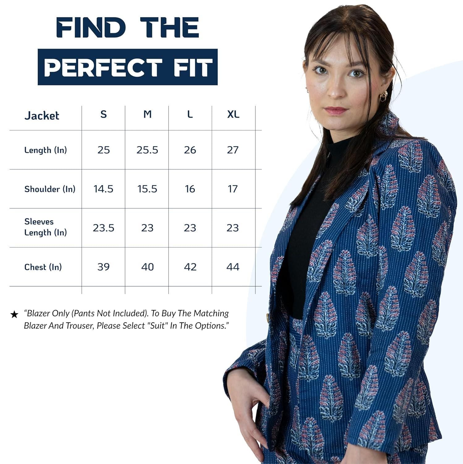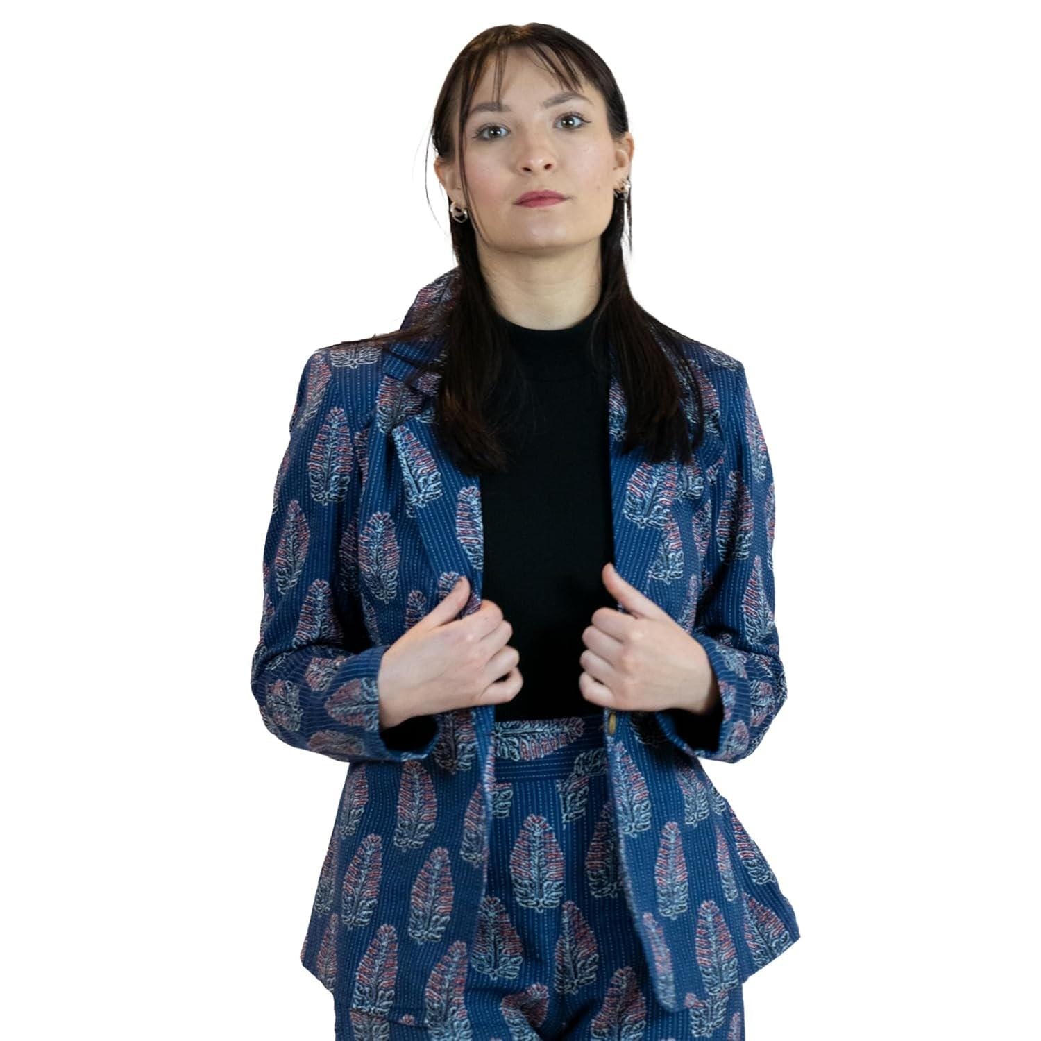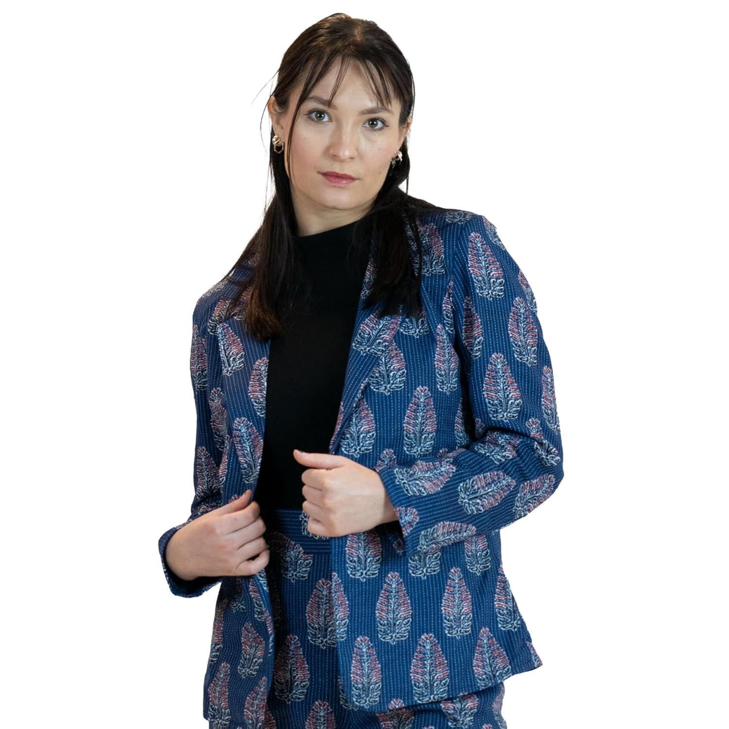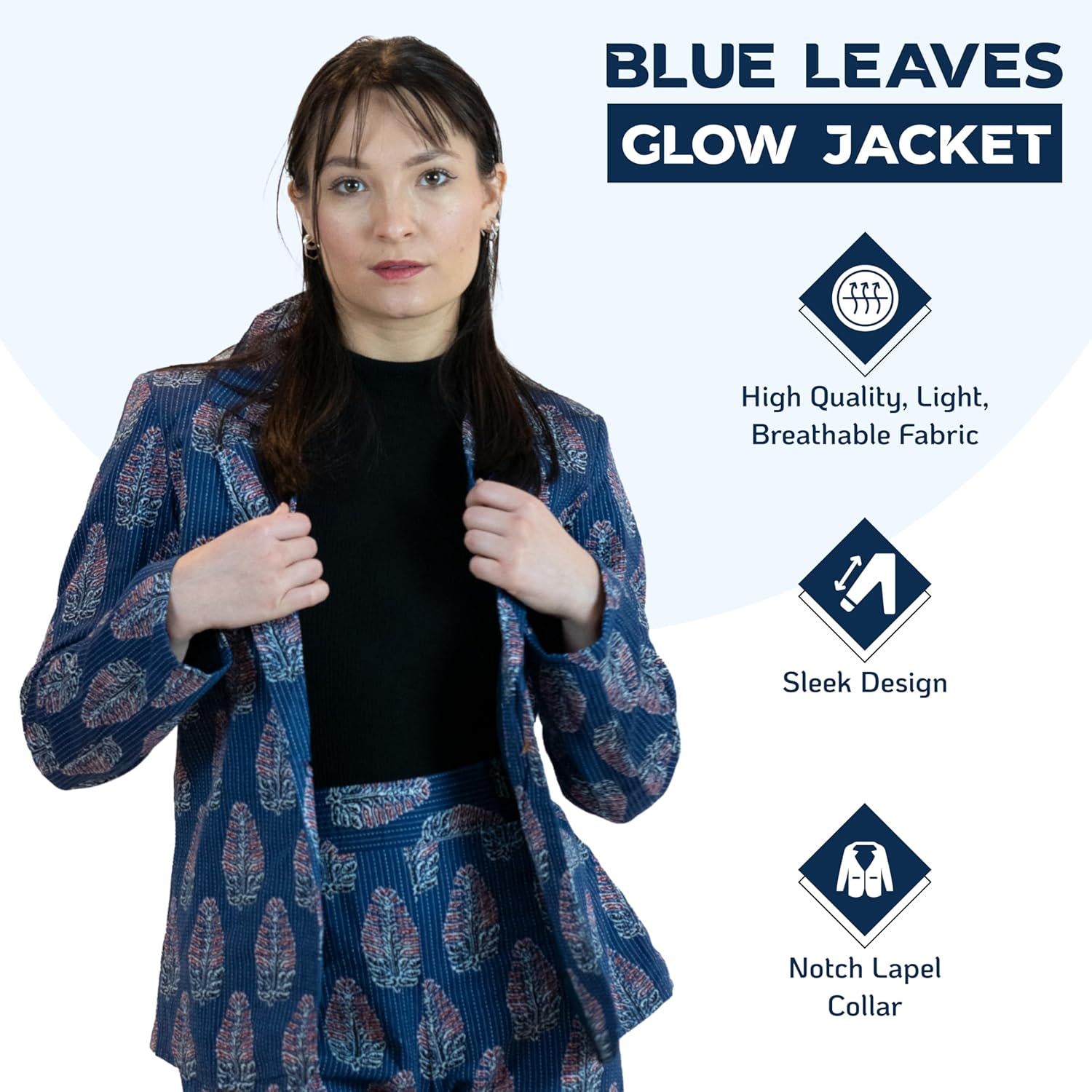 Add seasonal charm to your wardrobe with this elegant Blue Leaves Jacket for Women. Designed as a floral full sleeve blazer, it features a bold and vibrant fall leaves print in shades of blue, red, and white. Made from a breathable linen blend fabric, this dressy casual blazer is ideal for wedding guest attire, cocktail parties, and business casual outfits.