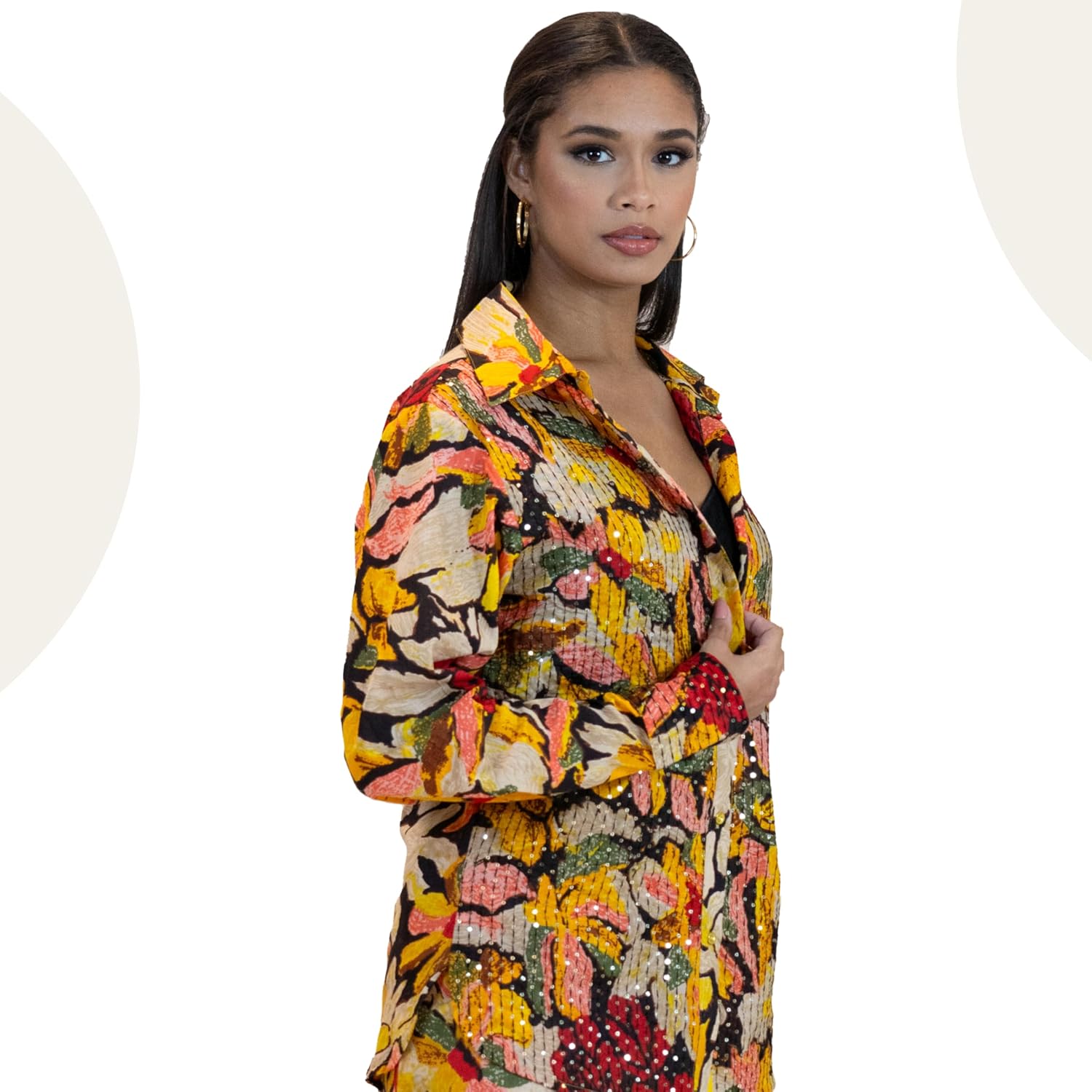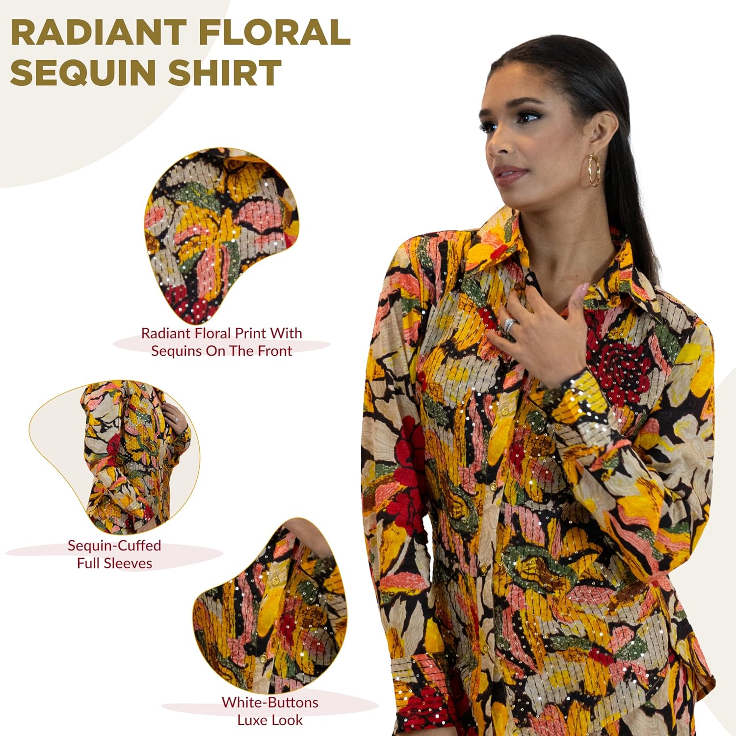 Yellow Sequin Blouse – Sparkly Floral Party Shirt Women