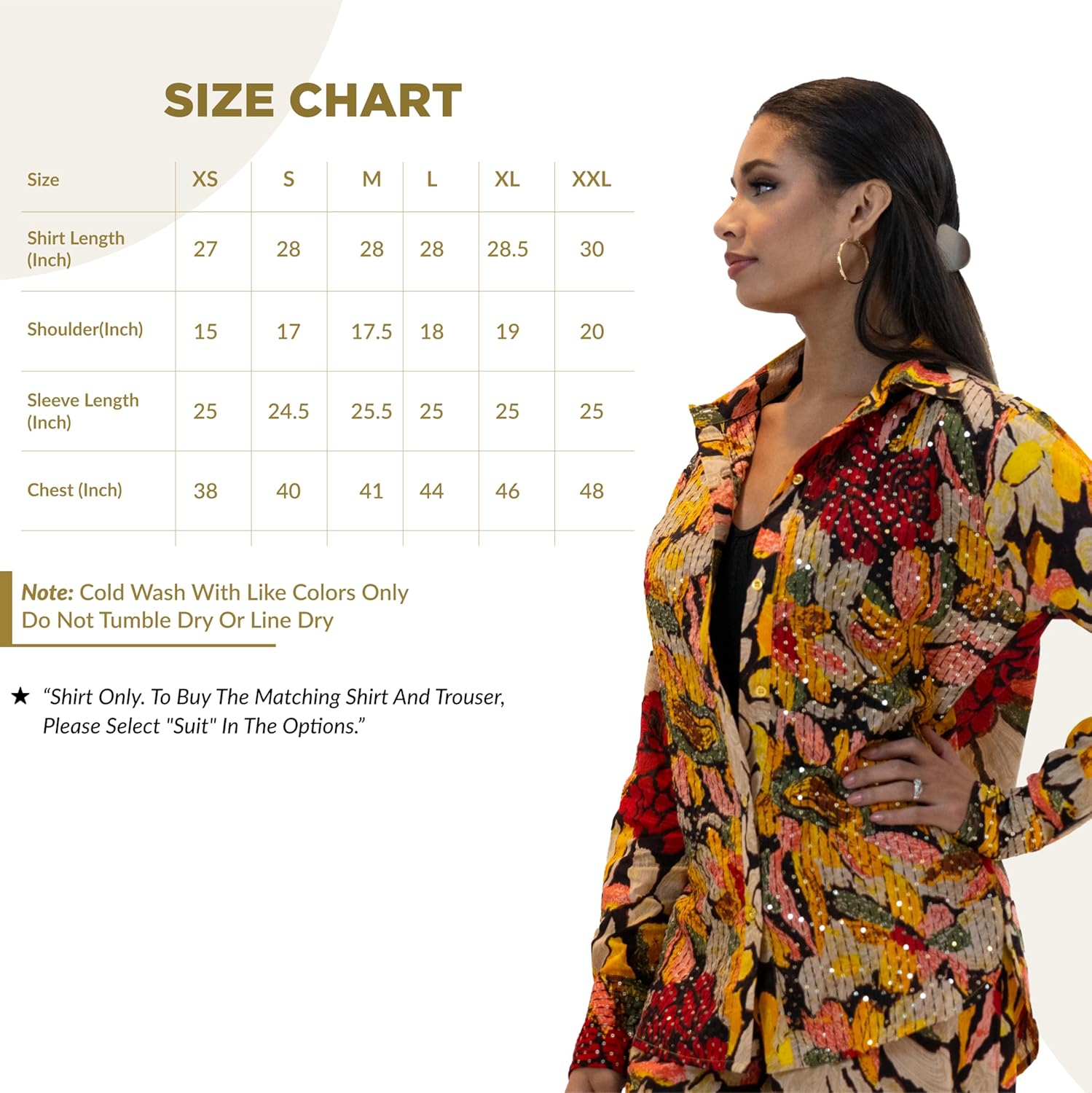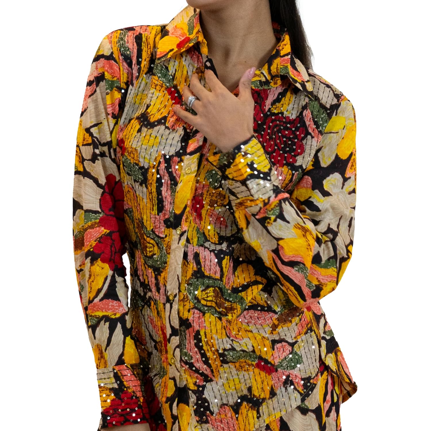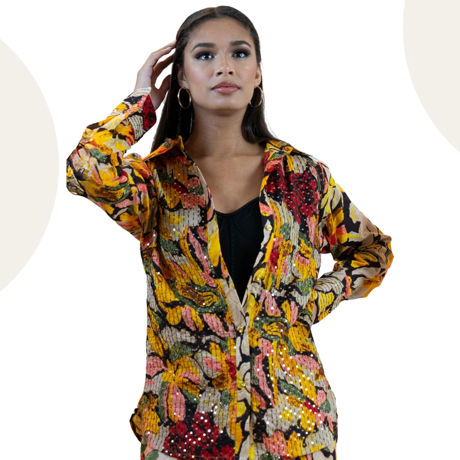 Sparkle That Moves with You: This Yellow Button Down Colourful Blouse features a delicate floral sequin design on the front and on the cuff sleeves, while the back remains sequin-free for breathability. It adds a soft shimmer that feels stylish yet effortless for your daily life