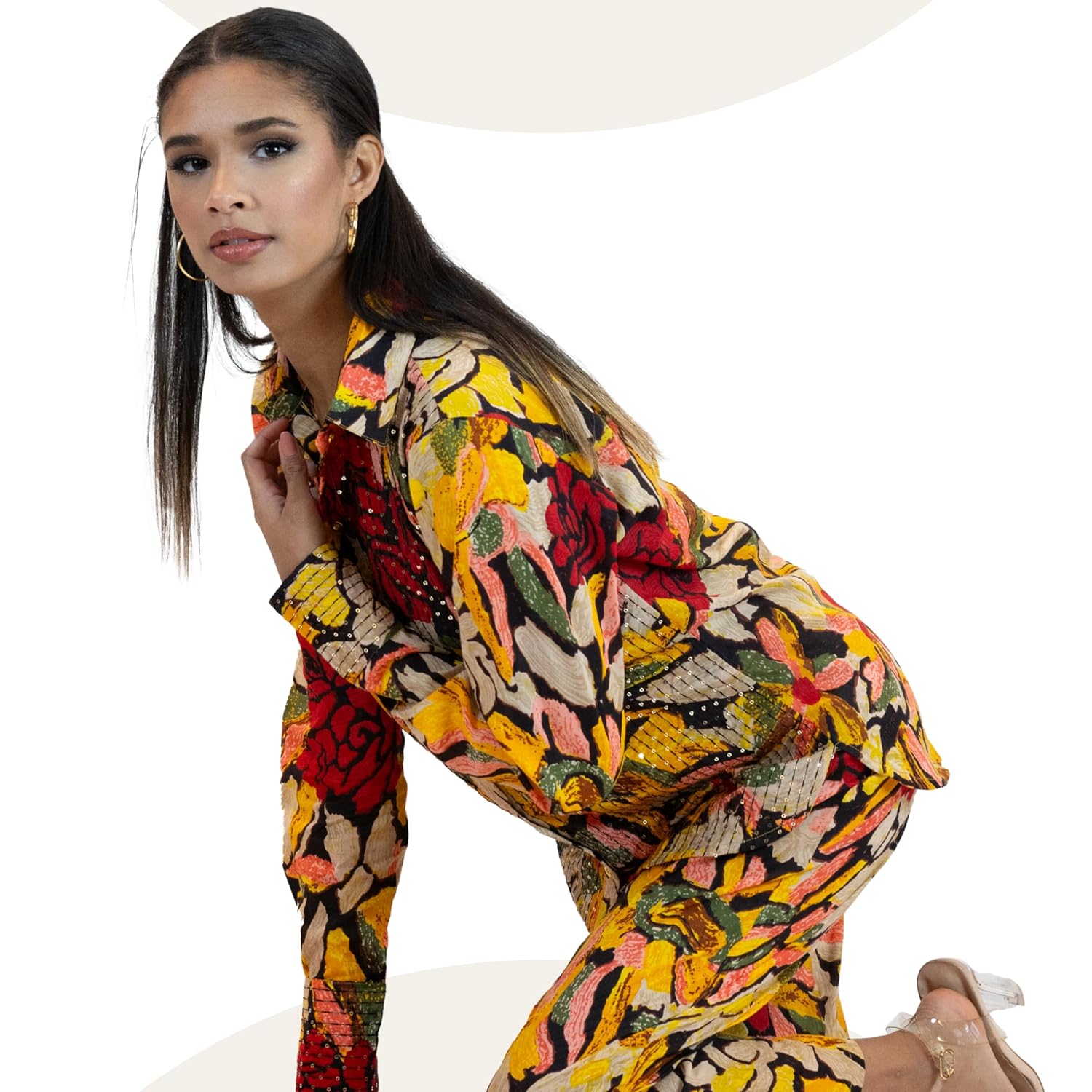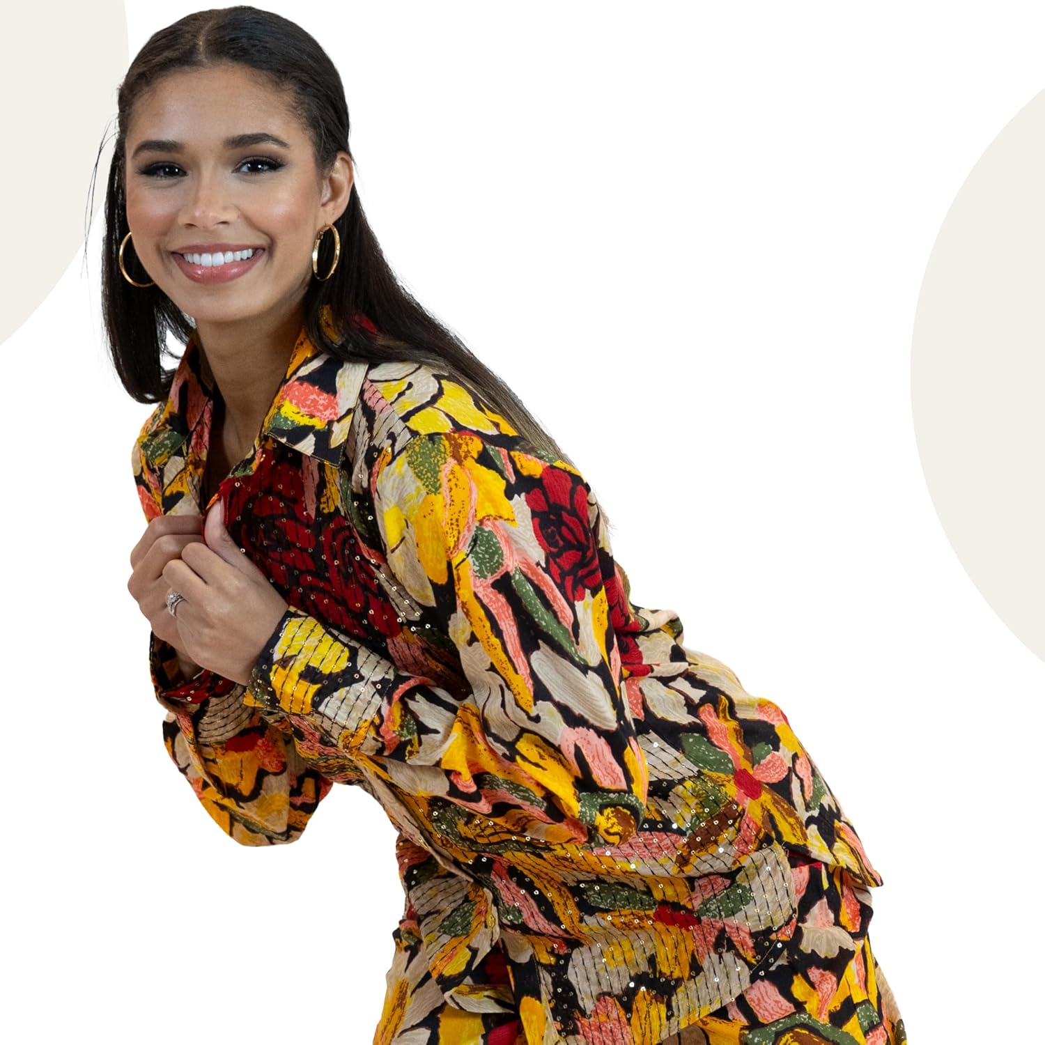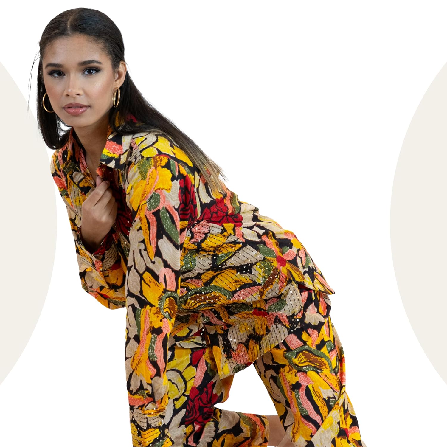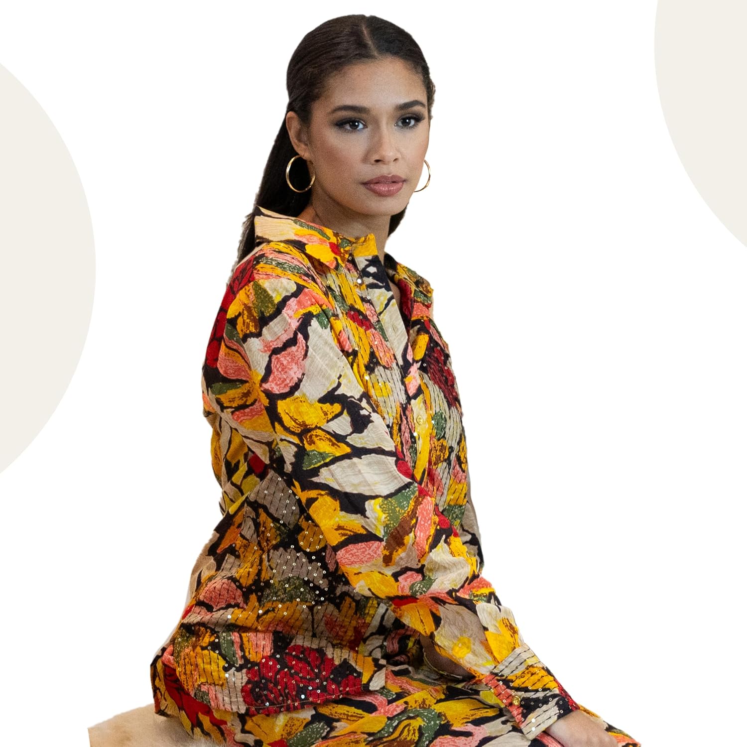 Sparkle That Moves with You: This Yellow Button Down Colourful Blouse features a delicate floral sequin design on the front and on the cuff sleeves, while the back remains sequin-free for breathability. It adds a soft shimmer that feels stylish yet effortless for your daily life